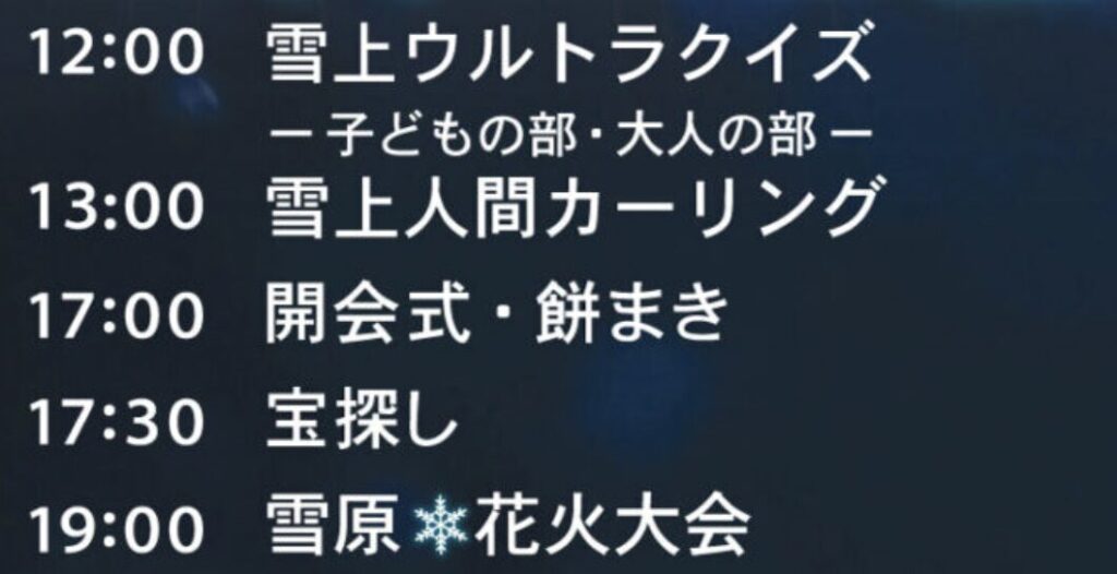 2部制のクイズ大会「雪上ウルトラクイズ」や、「雪上人間カーリング」、「宝探し」など、子どもから大人まで楽しめるイベントが盛りだくさん!