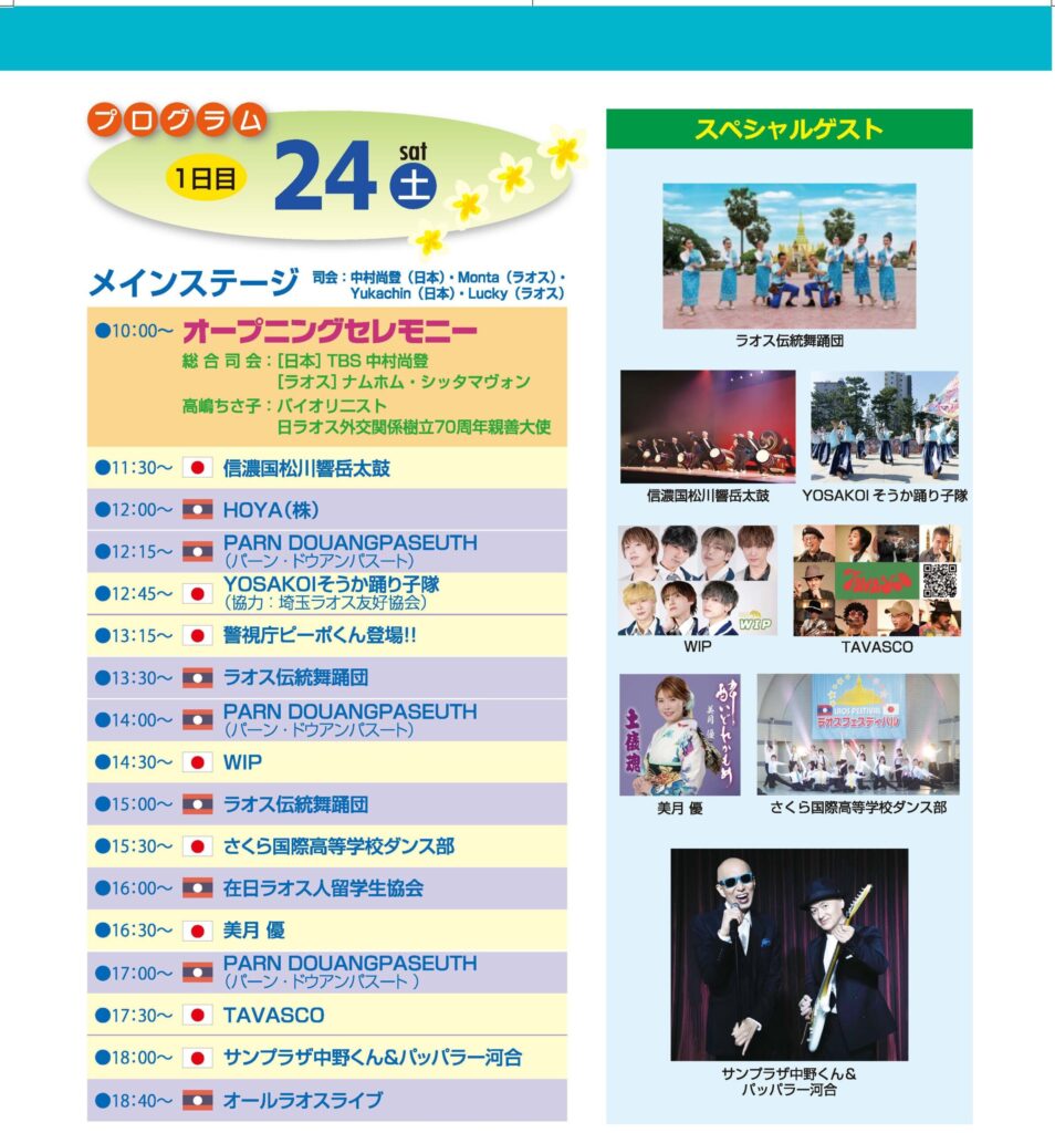 メインステージでは、ラオス舞踊、ラオス伝統楽器奏、ラオスアーティストと日本のアーティストによる歌や踊りの鑑賞、ラオス語講座、ラオスダンスレクチャーなど来場者参加型の催しもお楽しみ頂きます。