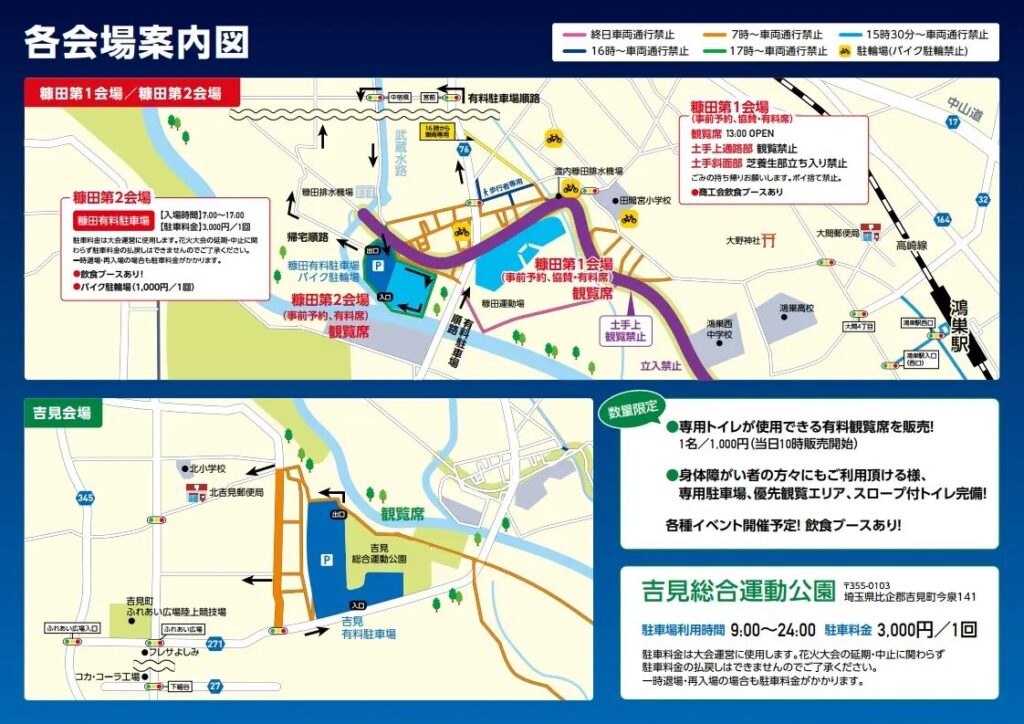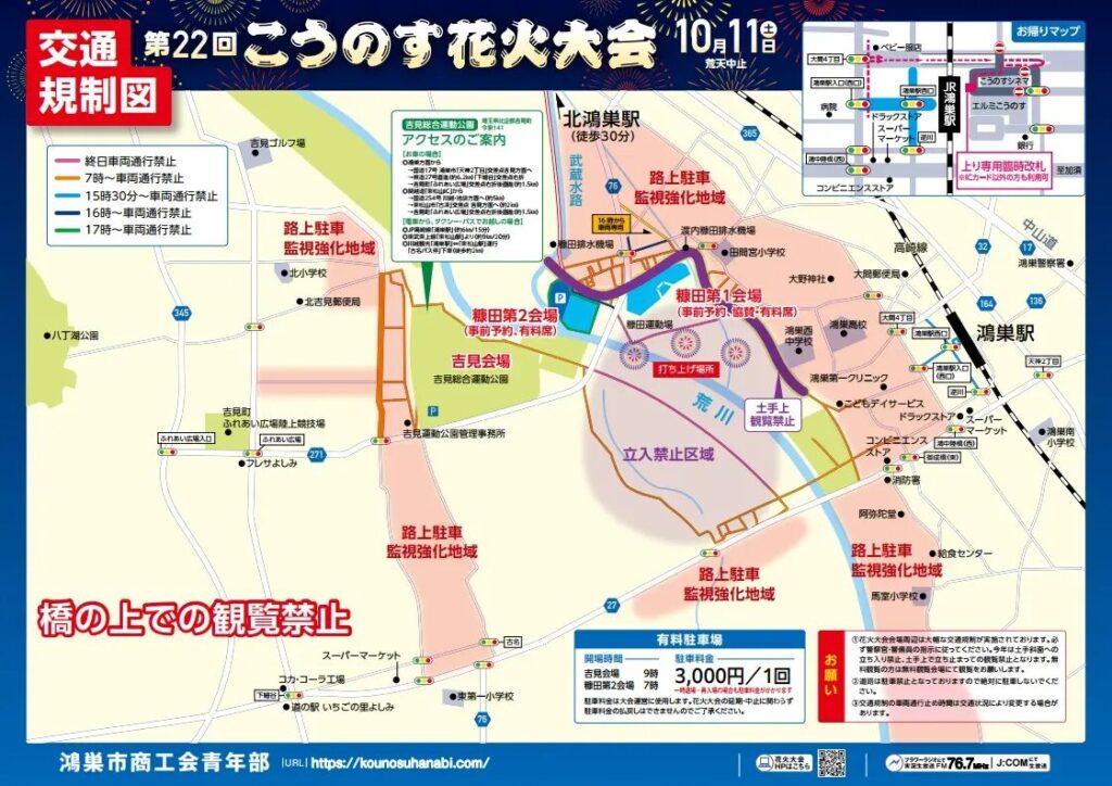 花火大会当日に、【会場周辺】及び【鴻巣駅周辺】で交通規制が行われます。